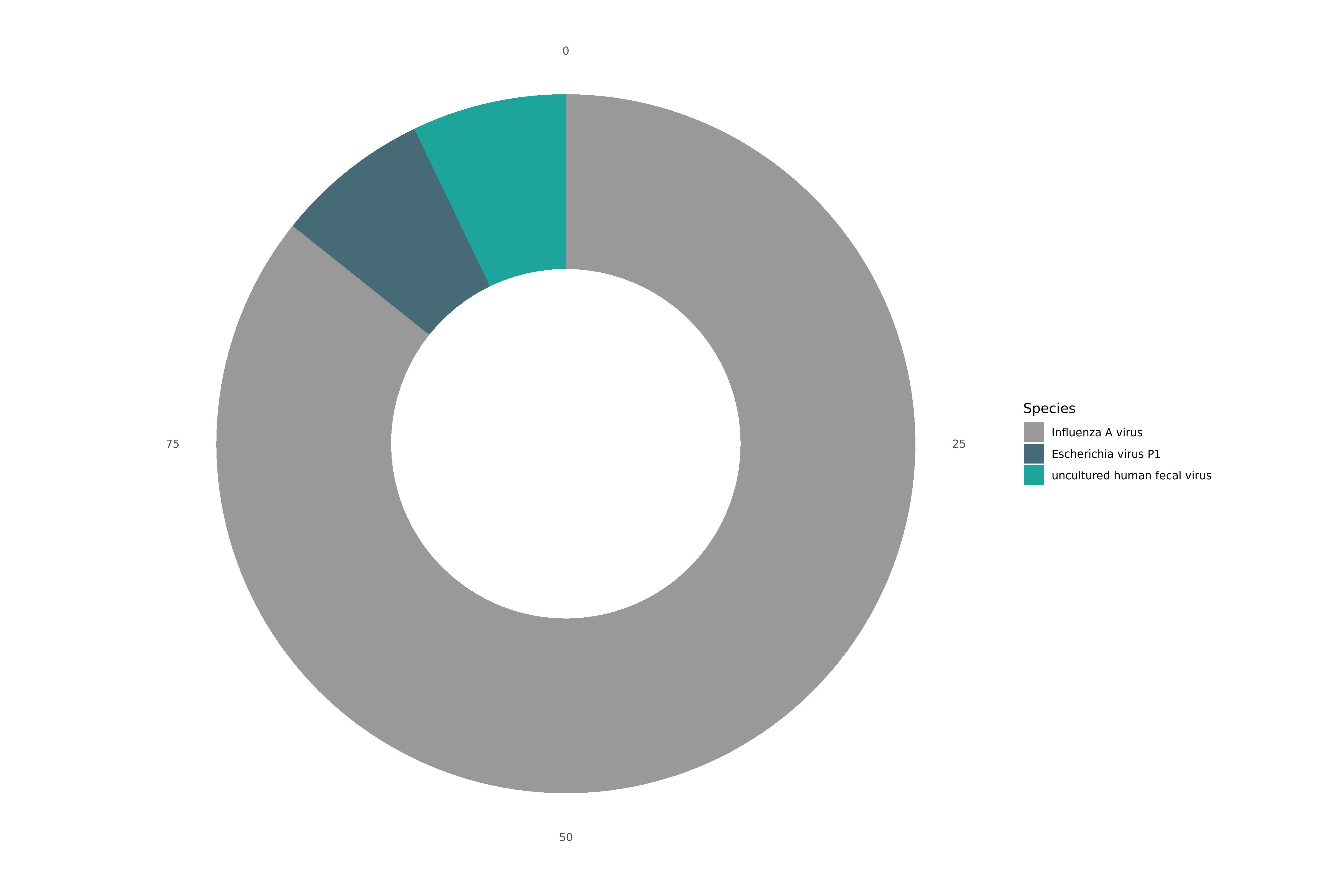 | 91.2% Influenza A virus; 6.4% Escherichia virus P1; 6.4% uncultured human fecal virus |